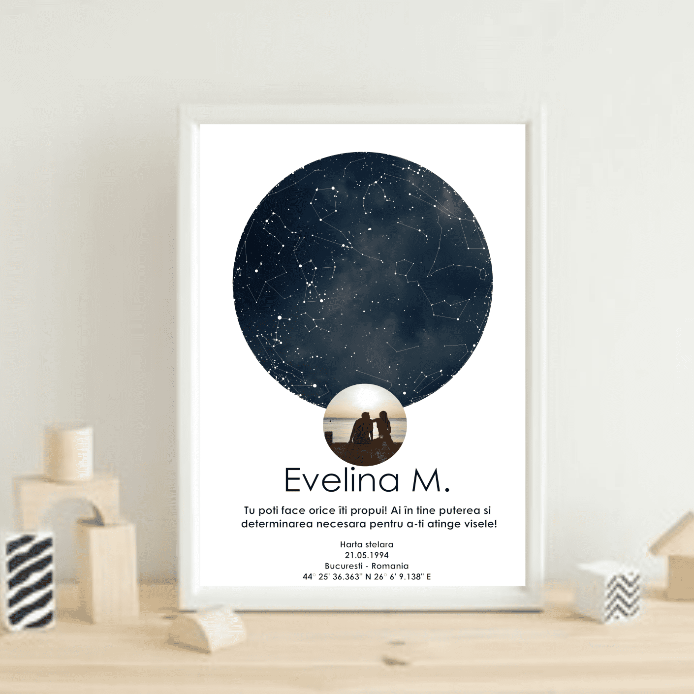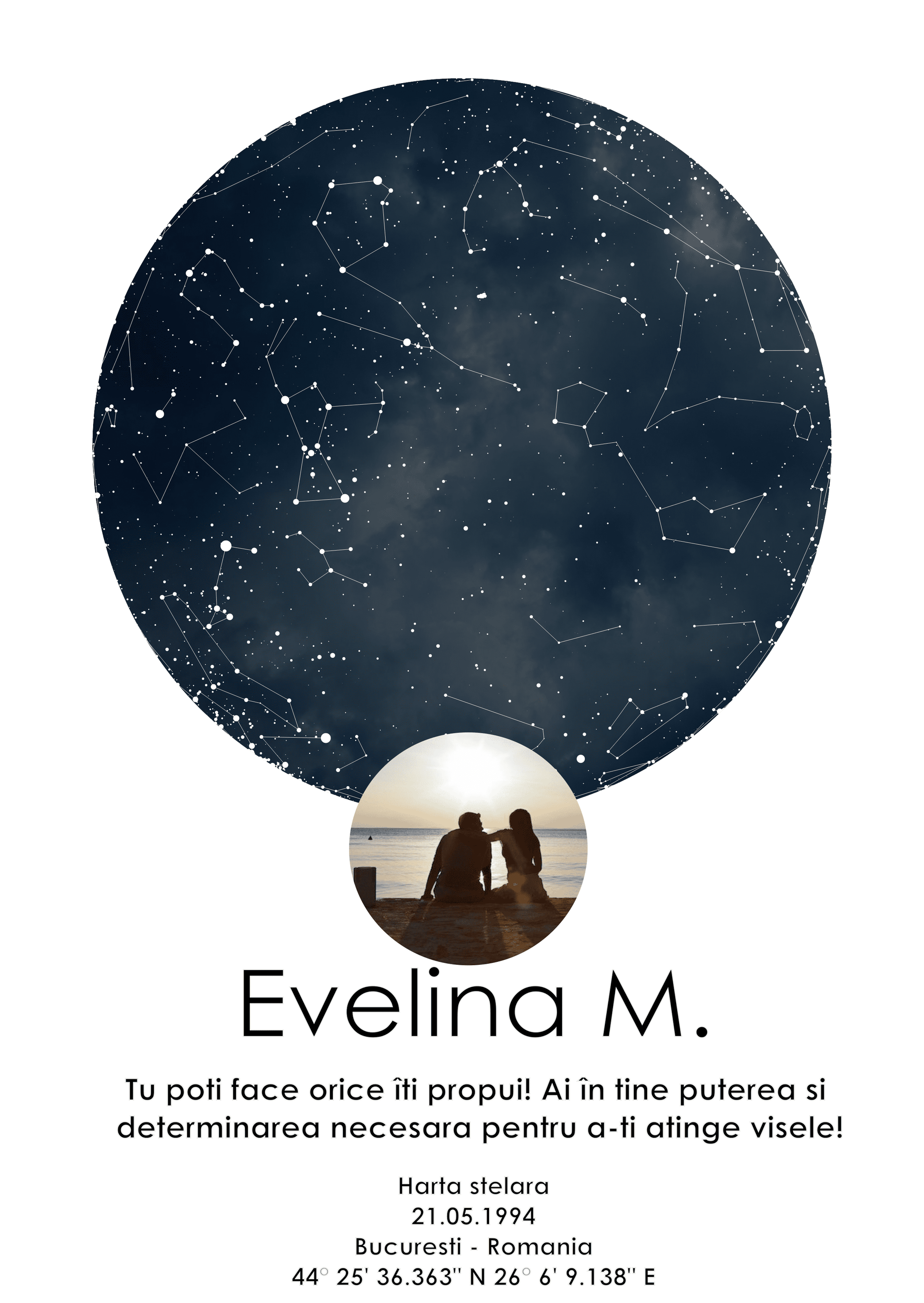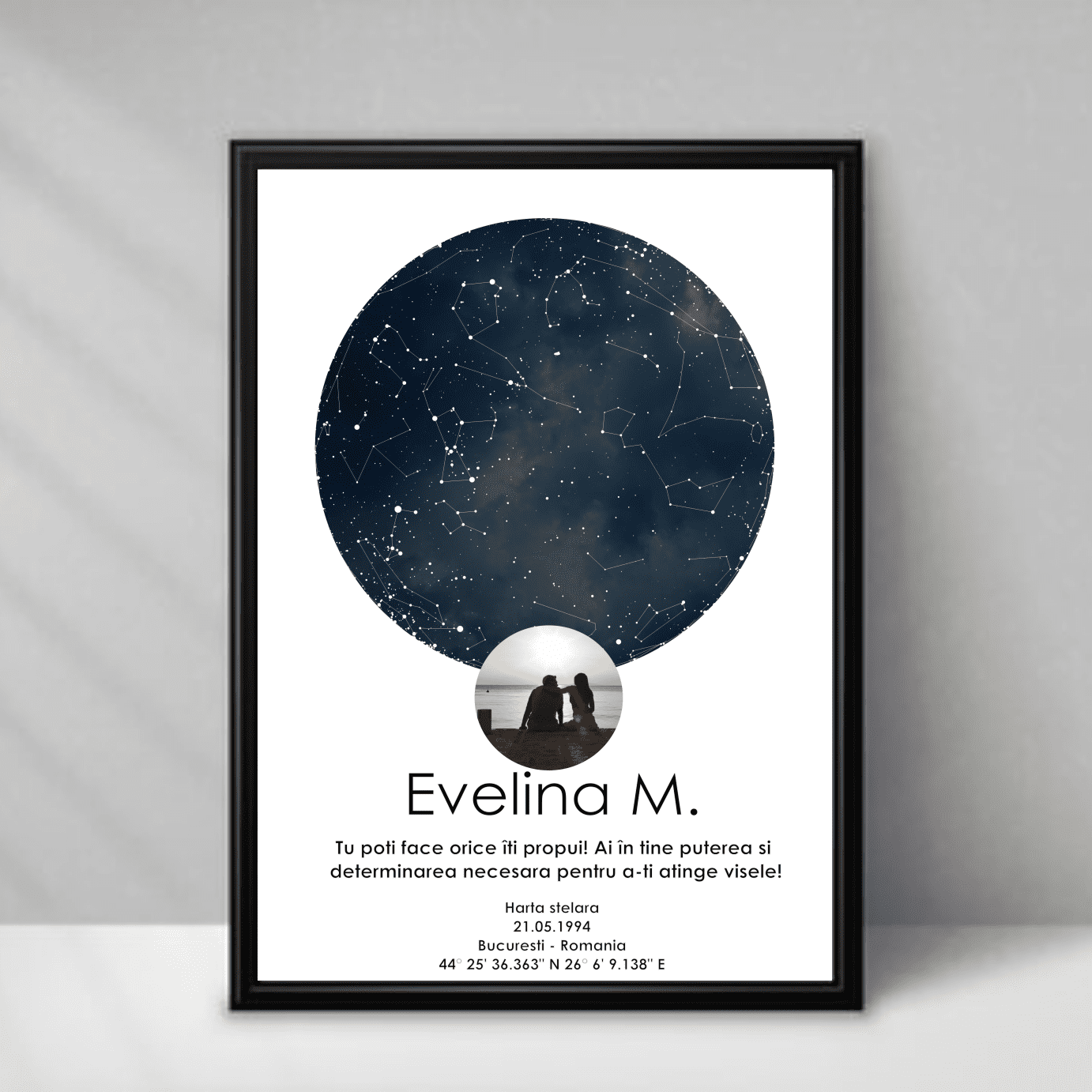 Harta Stelara Personalizata cu Poza, un produs cu adevarat original, lucrat manual pentru fiecare client in parte, grafica personalizata cu atentie de catre specialistii nostri in desing grafic.